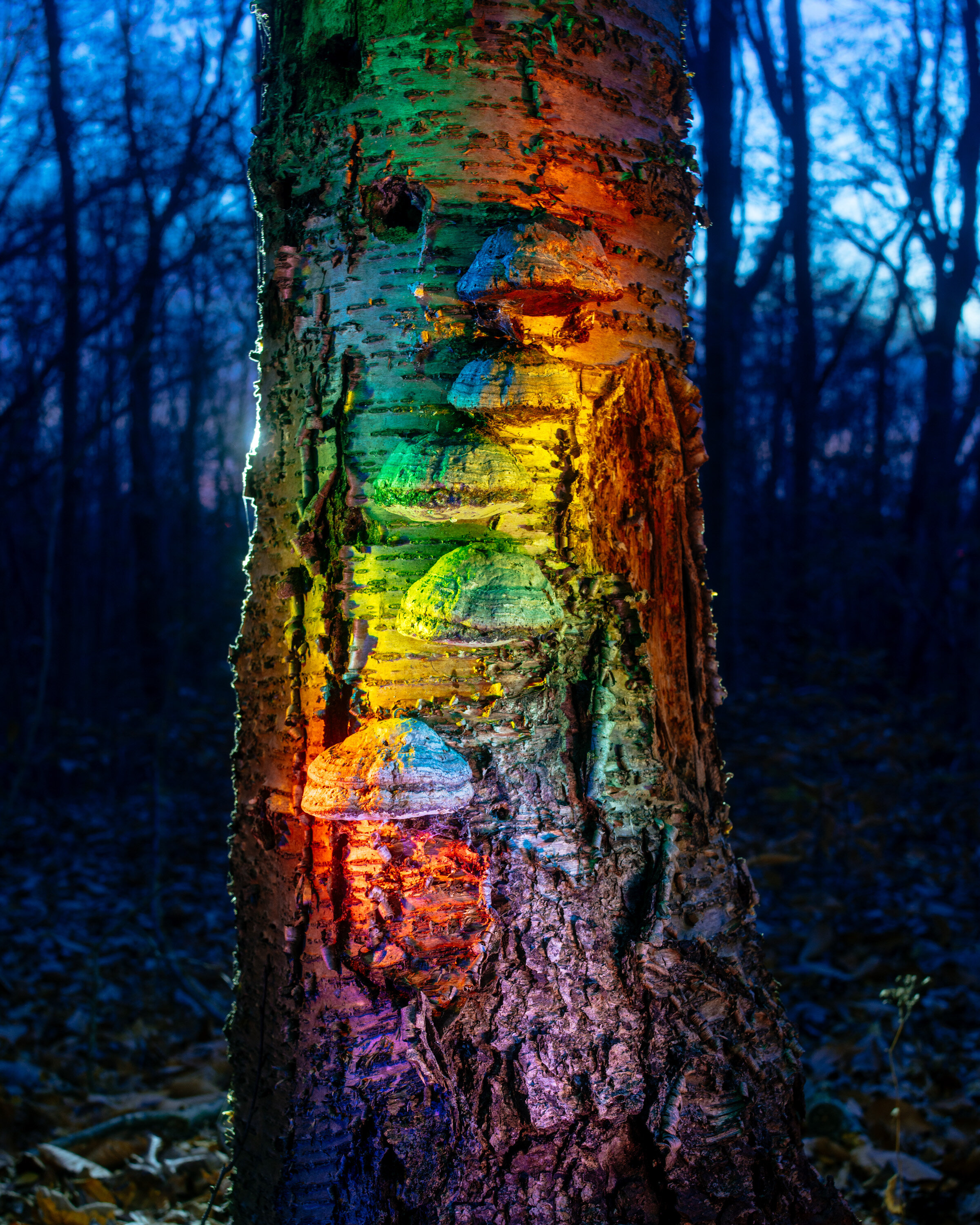 "Prismaterra" is a collection of photographs first begun in 2018. The images are created as a meditation with the natural world expressed through observing nature while controlling light, perspective and captured time. The images are all created during the black and blue of night. The prismatic lighting is my reflection of the often overlooked or simply dormant magic within elements of our natural world. By exploring simple natural phenomena and experimenting with light and exposure times, I have found healing and excitement that I deeply cherish.